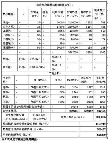 根據(jù)廈門海景綠苑活水SPA館項(xiàng)目采用熱泵型冷熱源機(jī)組和柴油鍋爐加制冷空調(diào)的兩種應(yīng)用模式進(jìn)行節(jié)能評(píng)估如下表: