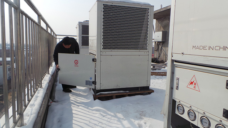 工程位于新疆和田地區于田縣于田職業學校,總建筑面積為32800㎡,末端為風機盤管,工程主要以采暖為主,當地冬季最低日平均溫度-18℃,采暖設計溫度-10℃,采暖季節112天,在冬天最冷的時候,剛好是放假時間,寒假放假30天房間供暖溫度降低至5℃左右即可,實際采暖時間大約82天。系統要求冬天采暖,冬天室內溫度要求±18℃,機組在冬天環境溫度-15℃溫度下能夠運行,保證能夠達到室內溫度達到要求。采暖系統采用38臺25P空氣源低溫熱泵采暖。
