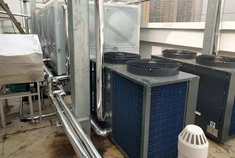 以江蘇宿遷某中學為例,本項目是校區宿舍熱水項目,按學校要求,每一個宿舍都要滿足充足的熱水供應。經過前期的考察,正旭熱泵為該校宿舍樓配置了4臺10P超低溫空氣源熱泵熱水機組,能夠輕松滿足學生每日正常用水量。