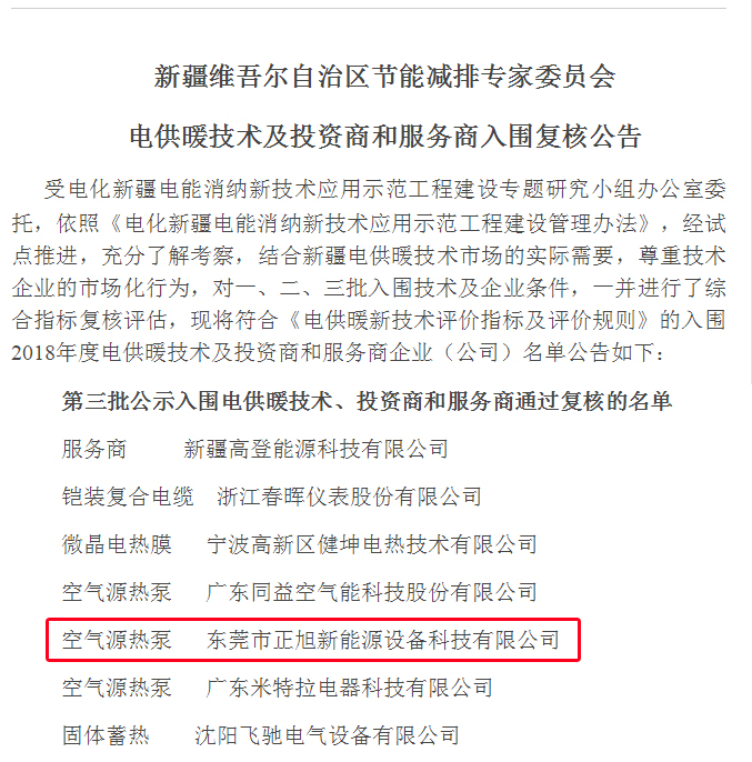 -東莞市正旭新能源設備科技有限公司為《空氣源熱泵》新疆電供暖技術及投資商和服務商第三批,并復核公告。