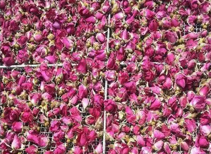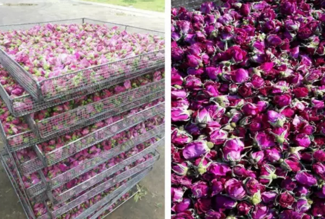 如果是烘干玫瑰花瓣,在玫瑰花盛開之后采摘即可。如果烘干的是玫瑰花蕾,需在花蕾剛剛散而未開的時候采收最好,采的太遲的話,恐防花蕾在烘干過程中花瓣散落。烘干的玫瑰花花蕾選用12小時內采摘的新鮮花蕾為佳,色澤鮮艷,花朵大小均勻,弱小花蕾少于5%;蕾托完整,無花柄,無雜質,無蟲蝕,無人為灑水,使水現象;無異味,香味純正;無半開花蕾,無開放花朵。分批次采摘的玫瑰花,不能一下就送入烘干房,烘干之前大量花蕾應進行攤晾以防發熱,然后準備好分批次、裝盤上車、入房。
