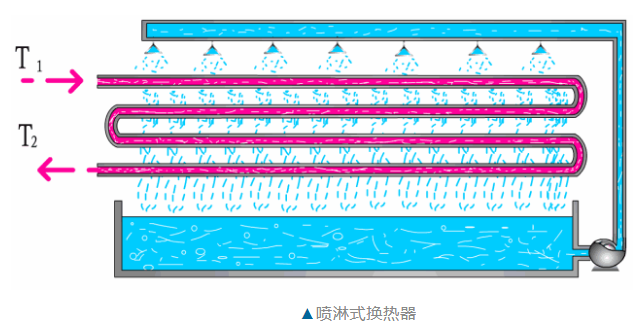 噴淋式換熱器是管式換熱器的一種,是將換熱管成排地固定在鋼架上,熱流體在管內流動,冷卻水從上方噴淋裝置均勻淋下,故也稱噴淋式冷卻器。噴淋式換熱器的管外是一層湍動程度較高的液膜,管外給熱系數較沉浸式增大很多。