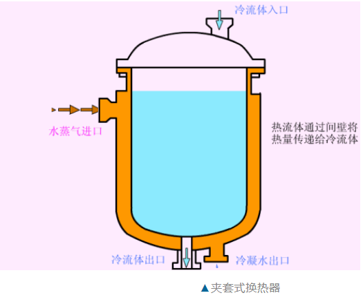 夾套式換熱器是板式換熱器的一種,在容器外壁安裝夾套制成,結構簡單;但其加熱面受容器壁面限制,傳熱系數也不高。為提高傳熱系數且使釜內液體受熱均勻,可在釜內安裝攪拌器。當夾套中通入冷卻水或無相變的加熱劑時,亦可在夾套中設置螺旋隔板或其它增加湍動的措施,以提高夾套一側的給熱系數。為補充傳熱面的不足,也可在釜內部安裝蛇管。夾套式換熱器廣泛用于反應過程的加熱和冷卻。