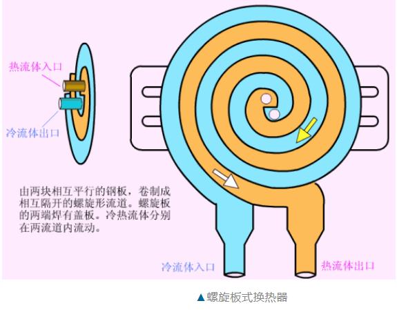 螺旋板換熱器屬于板式換熱器的一種,是由兩張平行的金屬板卷制而成,在其內部形成兩個同心的螺旋形通道。換熱器中央設置隔板,將螺旋形通道隔開,兩板之間焊有定距柱以維持通道間距。