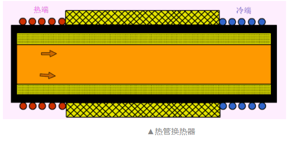 熱管是由一根抽除不凝性氣體的密封金屬管內充以一定量的某種工作液體而成。工作液體在熱端吸收熱量而沸騰汽化,產生的蒸汽流至冷端冷凝放出潛熱,冷凝液回至熱端,再次沸騰汽化。如此反復循環,熱量不斷從熱端傳至冷端。