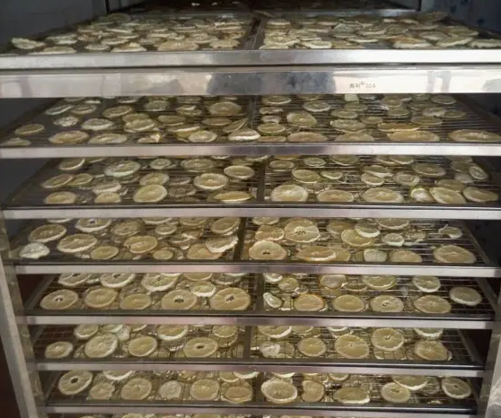 2. 將檸檬片整齊擺放在通風(fēng)托盤上,設(shè)置烘干房溫度為65攝氏度,濕度設(shè)置為5%,烘干3小時(shí);