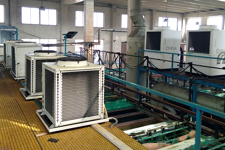 作為一款新型節能環保的設備,空氣源熱泵在生活熱水、居民采暖及農業領域上的應用已廣泛被市場接受,但在工業領域卻不被人們所熟知。其實,空氣源熱泵目前也能成熟的應用在印染、電子、電鍍等工業領域,幫助客戶有效節能減排、省錢增效。以正旭在山東某電鍍廠的高溫熱水項目為例,客戶提出對其鍍鎳、鍍鉻生產線進行節能改造,經實地調研并與廠方多次深入溝通,我們為其配置了5P、7P、10P、13P高溫機共27臺空氣源高溫熱泵(氟機+鈦管),總制熱量達到735KW,滿足了客戶生產需求,每年為客戶節能上百萬元電費,得到了客戶的高度評價。
