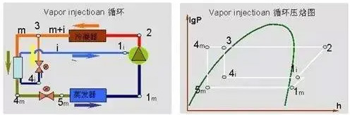 噴氣增焓技術(shù)是一套由噴氣增焓壓縮機(jī)、熱水換熱器、蒸發(fā)器等配件組成的完整系統(tǒng),其核心是噴氣增焓壓縮機(jī)。這種壓縮機(jī)增加了一個額外的蒸汽噴射口,壓縮機(jī)從吸氣口接收蒸發(fā)器傳過來的熱量,從蒸汽噴射口接收管道另一頭補(bǔ)充過來的蒸汽,用于冷卻管路中不斷循環(huán)的制冷劑,將傳統(tǒng)熱泵壓縮機(jī)一段式壓縮過程分為一個準(zhǔn)二級的壓縮過程,以此增加主循環(huán)的制冷劑流量,增加流經(jīng)室外換熱器的液體制冷劑焓差,從而增加制熱量。