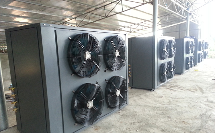 熱泵烘干系統(tǒng)工作時(shí),熱泵主機(jī)從空氣中吸收免費(fèi)的熱量,通過冷媒的物理相變實(shí)現(xiàn)熱量轉(zhuǎn)移,對烘干房內(nèi)的物料進(jìn)行干燥處理,整個(gè)過程只有壓縮機(jī)做功需要用到少量電能;當(dāng)烘干房內(nèi)的溫度達(dá)到預(yù)設(shè)的溫度之后,烘干房內(nèi)的感溫探頭就會給熱泵主機(jī)發(fā)送信號,機(jī)組自動停止運(yùn)行,熱量在烘干房內(nèi)通過循環(huán)風(fēng)機(jī)的作用不斷循環(huán)加熱,這時(shí)就只有風(fēng)機(jī)在耗電。
